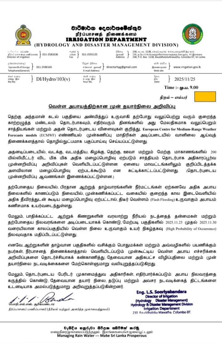 அதனடிப்படையில், வடக்கு, வடமத்திய, கிழக்கு, தெற்கு, ஊவா மற்றும் மேற்கு மாகாணங்களில் 200 மில்லிமீட்டர் விட மிக அதிக மழைப்பொழிவு ஏற்படும் சாத்தியம் தொடர்பாக அதிகாரப்பூர்வ முன்னறிவிப்பு அறிவிப்புகள் வெளியிடப்பட்டுள்ளன. ஏனைய மாவட்டங்களிலும் குறிப்பிடத்தக்க அளவிலான மழைப்பொழிவு ஏற்படக்கூடும் என சுட்டிக்காட்டப்பட்டுள்ளது.