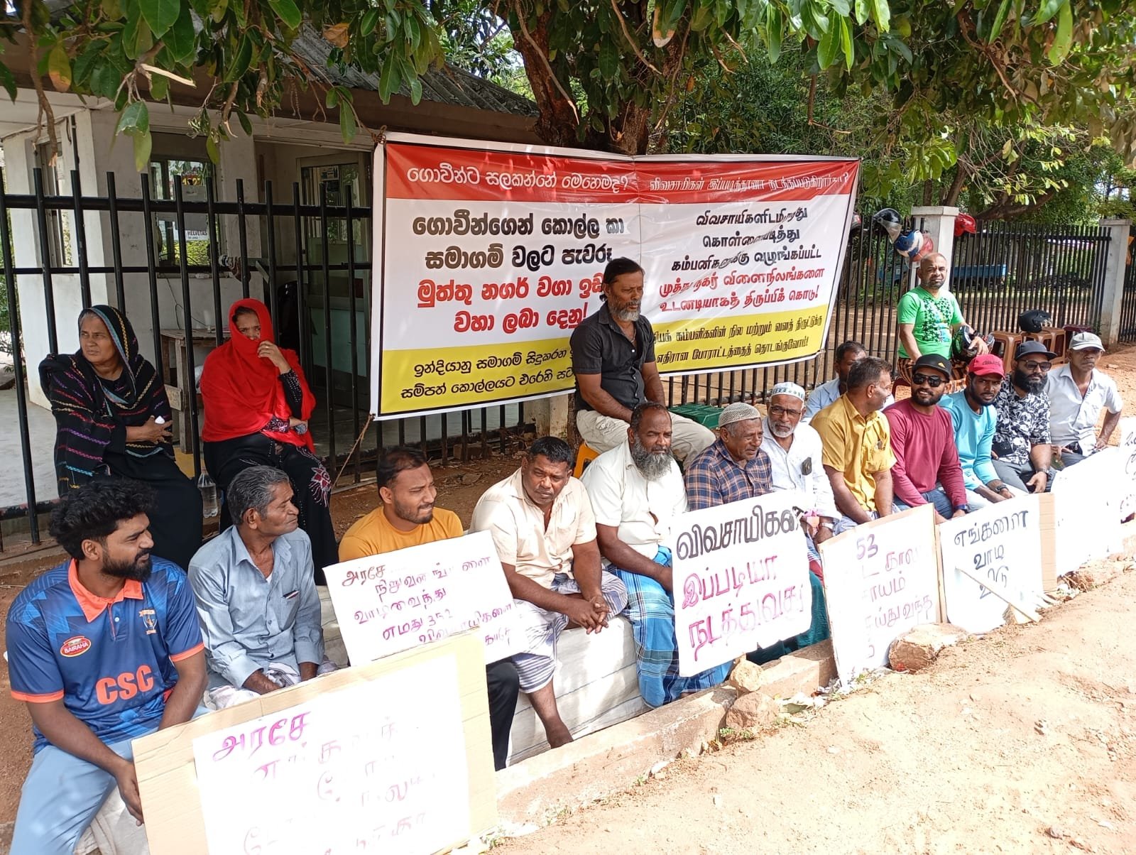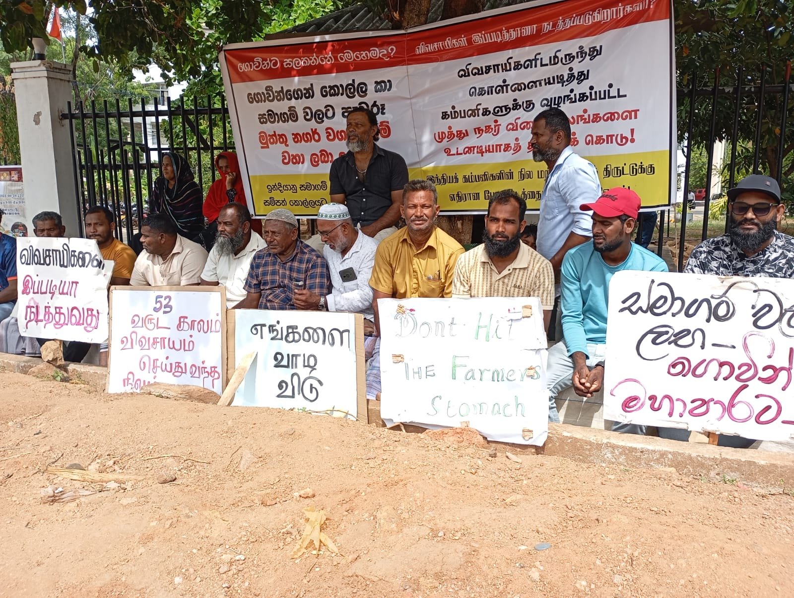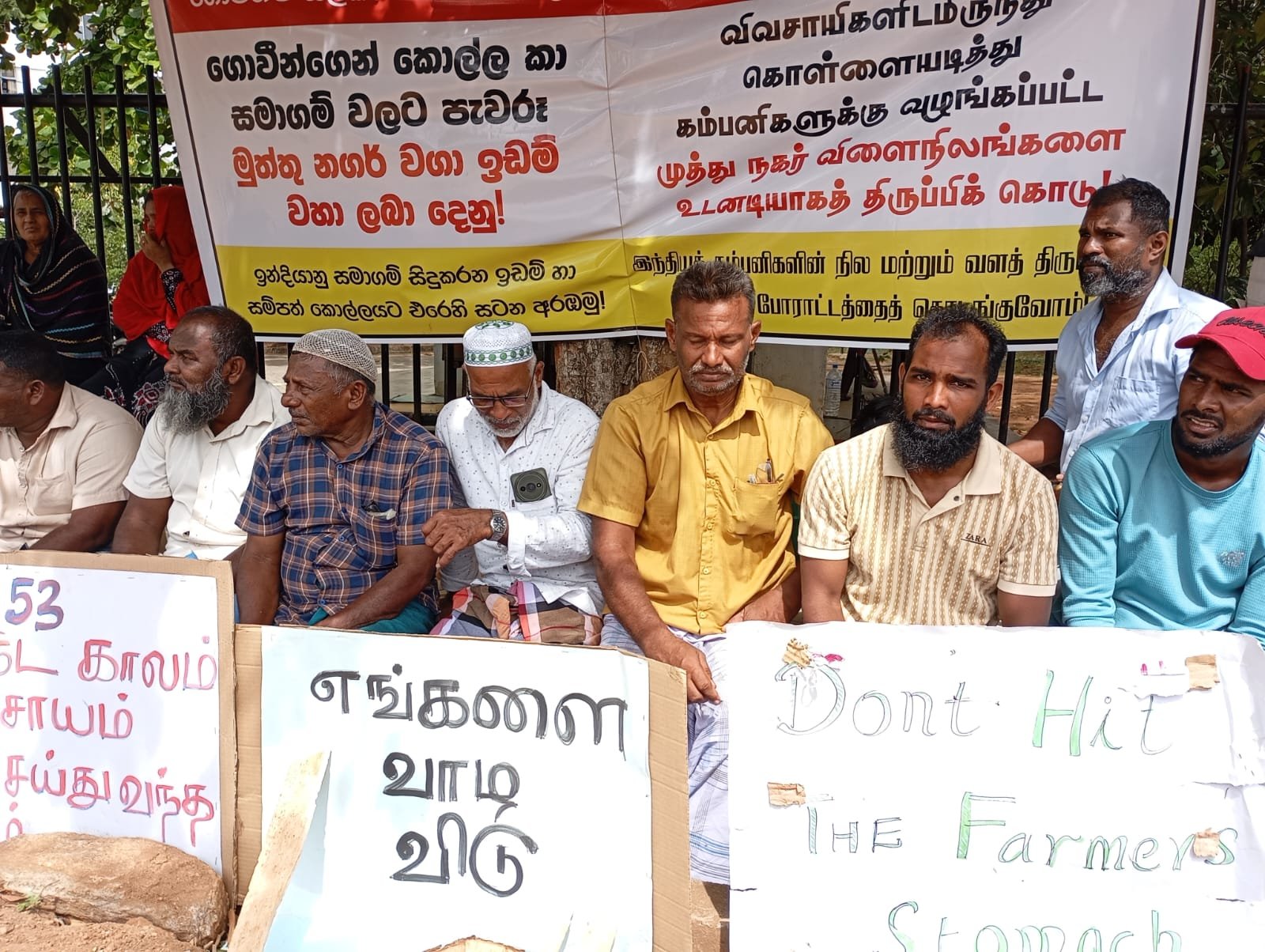 பொய் வேண்டாம்,எங்கள் நிலம் எங்களுக்கு வேண்டும்,விவசாயிகளை இப்படியா நடத்துவது விவசாயிகளிடமிருந்து கொள்ளையடித்து கம்பனிகளுக்கு வழங்கப்பட்ட முத்து நகர் விளை நிலங்களை உடனடியாக திருப்பிக் கொடு மற்றும் அரசே எங்களுக்கு சோறு போடும் நிலத்தை மீட்டுத் தா?,போன்ற பல வாசகங்கள் அடங்கிய பதாகைகளை ஏந்தியவாறும் சத்தியாக் கிரகத்தில் ஈடுபட்டு வருகின்றனர்.