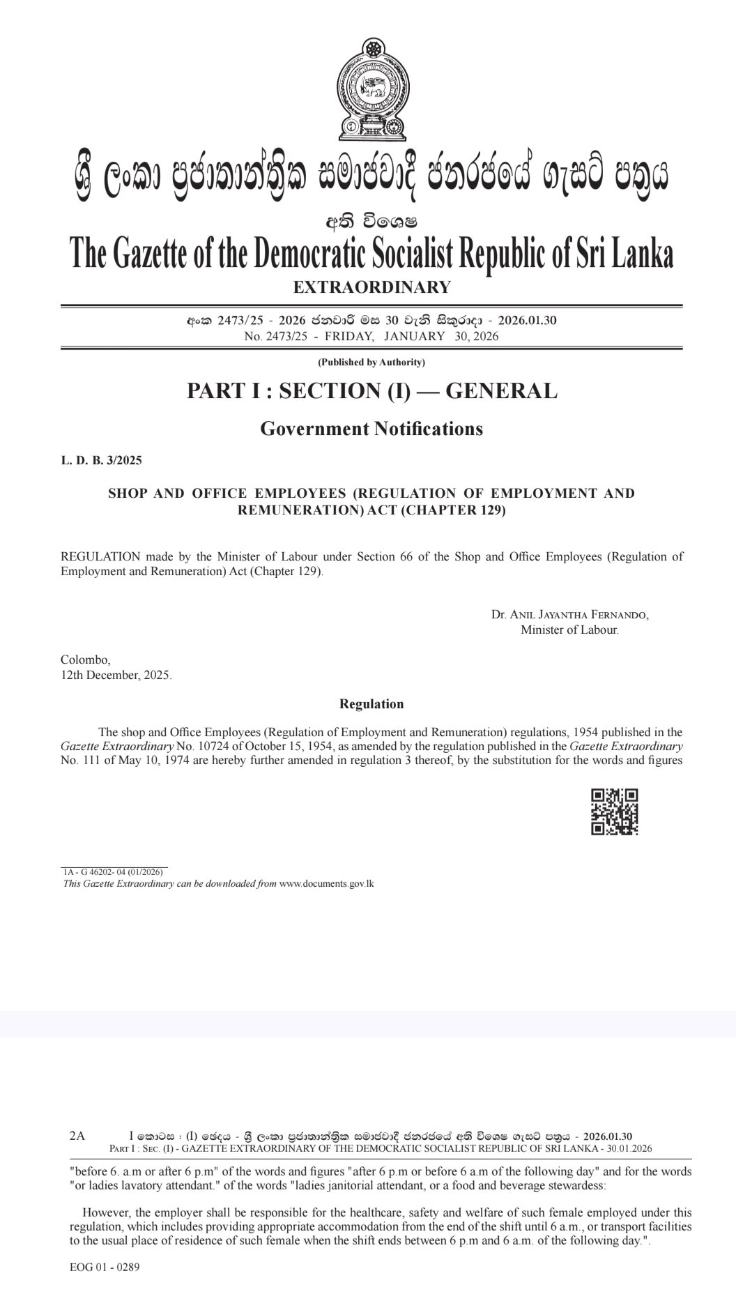 18 வயதுக்கு மேற்பட்ட பெண்கள் இரவுநேரத்தில் பணியாற்ற அனுமதி : அதிவிசேட வர்த்தமானி வெளியீடு!
