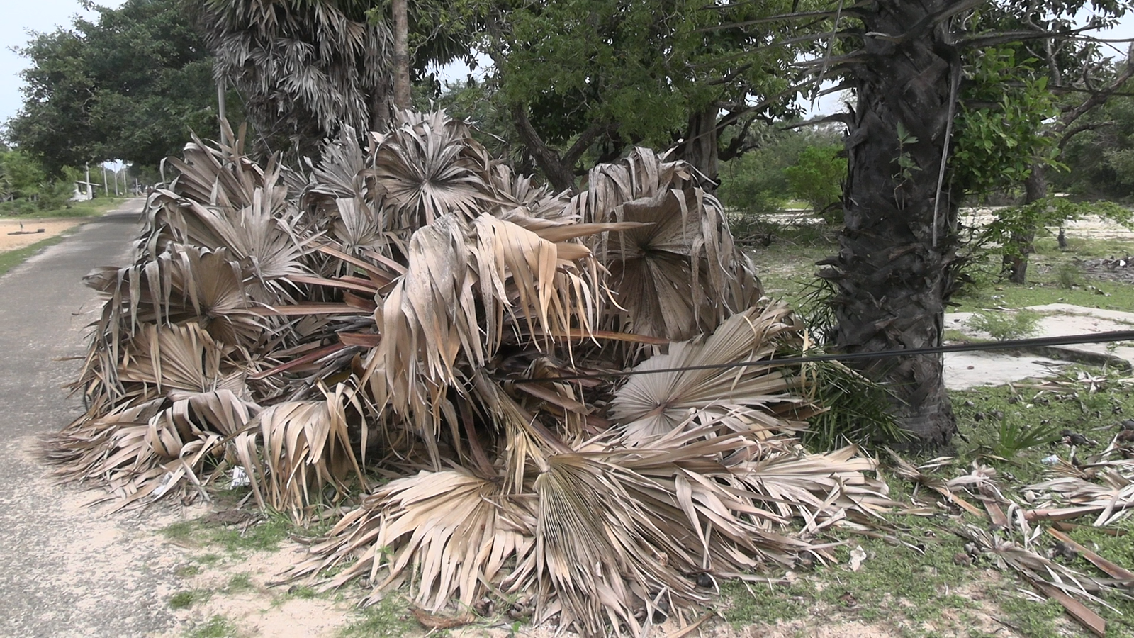 வடமராட்சி கிழக்கு வத்திராயனில் பனை மரம் ஒன்று ரெலிகொம் வயர் மீது முறிந்து விழுந்த நிலையில் காணப்படுகின்றது.