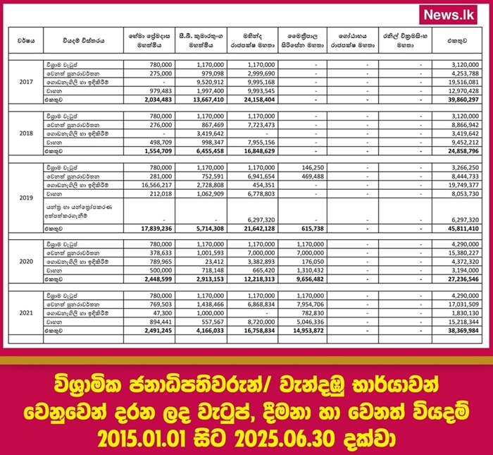 2015 முதல் 2025 வரை ஓய்வுபெற்ற ஜனாதிபதிகள் மற்றும் முதல் பெண்மணி சார்பாக செலவிடப்பட்ட சம்பளம், கொடுப்பனவுகள் மற்றும் பிற செலவுகள் குறித்த விவரத்தை அரசாங்கம் வெளியிட்டுள்ளது.