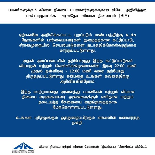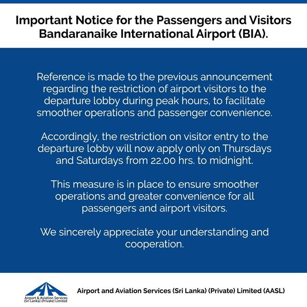 விமான நிலைய மற்றும் விமான சேவைகள் (AASL), பண்டாரநாயக்க சர்வதேச விமான நிலையத்தில் (BIA) உச்ச நேரங்களில் பார்வையாளர்கள் புறப்படும் மண்டபத்தினுள் நுழைவதற்கான கட்டுப்பாடு திருத்தப்பட்டுள்ளதாக அறிவித்துள்ளது.
