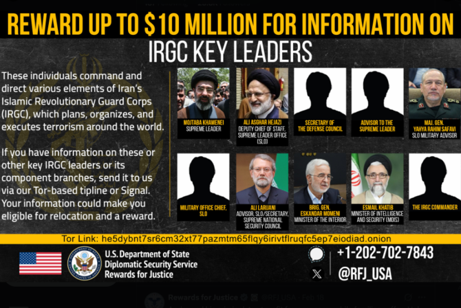 ஈரானின் புதிய உச்ச தலைவர் மொஜ்தபா கமேனி மற்றும் அந்நாட்டின் இஸ்லாமிய புரட்சிகர பாதுகாப்புப் படையின் (IRGC) உயர்மட்டத் தலைவர்கள் பற்றிய தகவல்களை வழங்குபவர்களுக்கு 10 மில்லியன் அமெரிக்க டொலர்கள் வரை நிதி வெகுமதி வழங்க அமெரிக்க இராஜாங்கத் திணைக்களம் தீர்மானித்துள்ளதாக, வெளிநாட்டு செய்திகள் தெரிவிக்கின்றன.