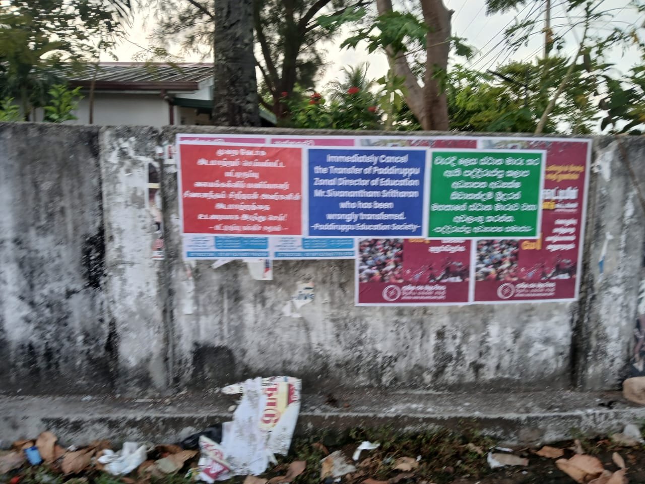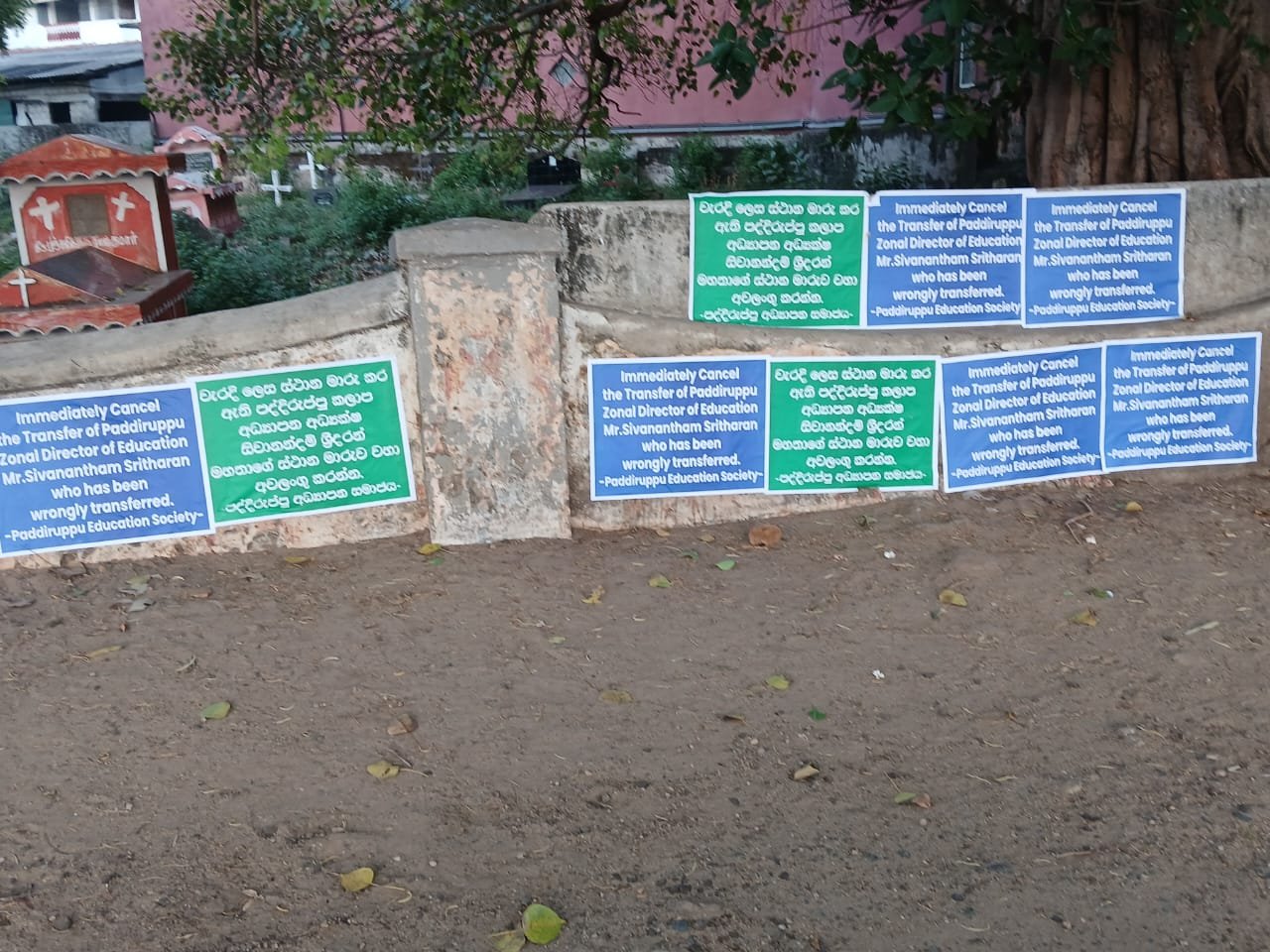 இந்த நிலையில் அவருக்கு இடமாற்றம் வழங்கப்பட்டு தற்போது பட்டிருப்பு வலையத்திற்கு புதிய பணிப்பாளராக செல்லத்துறை புவனேந்திரன் நியமிக்கப்பட்டுள்ள நிலையில் இடமாற்றம் பெற்ற முன்னாள் வலையக்கல்வி பணிப்பாளருக்கு ஆதரவாக திருகோணமலையில் கிழக்கு மாகாண ஆளுனர் அலுவலகத்திற்கு முன்பாக சிறிதரனுக்கு ஆதரவாக சுவரொட்டிகள் ஒட்டப்பட்டுள்ளது.