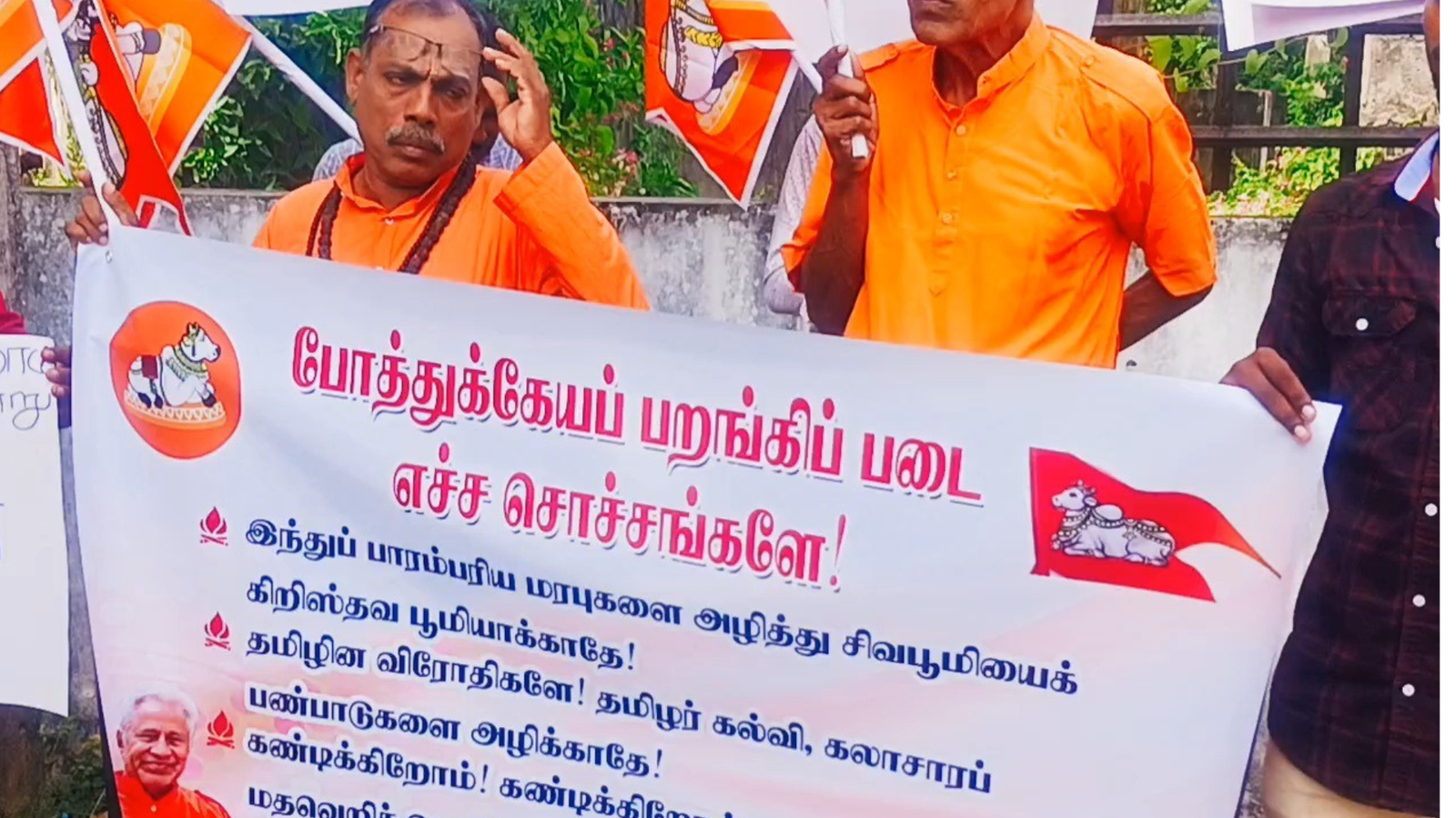 “இந்து பாரம்பரிய மரபுகளை அழித்து சிவபூமியை கிறிஸ்துவ பூமியாக்காதே, தமிழர் கல்விப் பண்பாட்டினை அழிக்காதே, வலயப் பணிப்பாளரின் மதவெறி செயற் பாட்டினை கண்டிக்கின்றோம், உடலின் உயிரான சைவத்தினை அழிப்பது தமிழன அழிப்பே, தமிழ் மண்ணின் தமிழ் கடவுளை அகற்றும் துணிவின் பின்புலம் யார்? தமிழன விரோதியே வலயத்தினை விட்டுபோ” என்ற வாசகங்கள் எழுதிய பாதாதைகள் ஏந்தியும் கோசமிட்டும் தமது எதிர்ப்பு போராட்டத்தினை முன்னெடுத்தனர்.