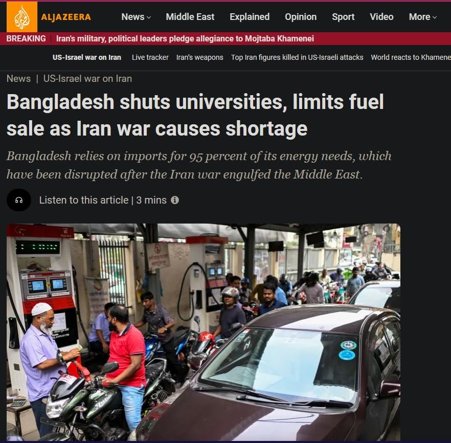 மத்திய கிழக்கில் இடம்பெறும் மோதல்கள் காரணமாக, மோசமடைந்து வரும் எரிபொருள் நெருக்கடியால், பங்களாதேஷ் அரசு பல்கலைக்கழகங்களை மூடியுள்ளதாக, சர்வதேச செய்திகள் தெரிவிக்கின்றன.