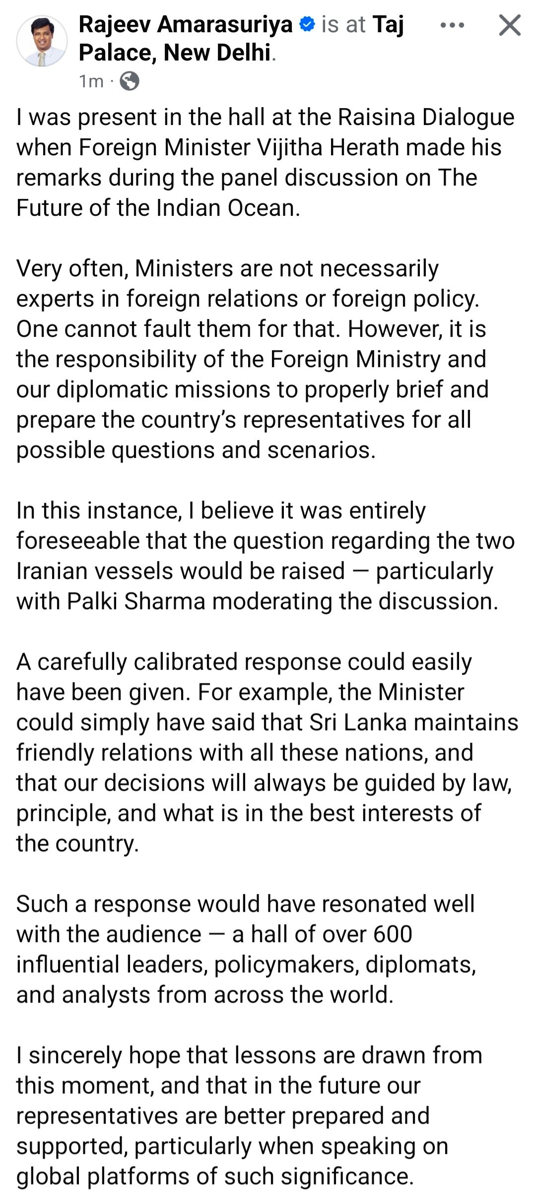 இந்த விவாதத்தின் போது தானும் சபையில் இருந்ததாகக் குறிப்பிட்டுள்ள ரஜீவ் அமரசூரிய, அமைச்சர்கள் எப்போதும் வெளிநாட்டுக் கொள்கை அல்லது சர்வதேச உறவுகளில் நிபுணர்களாக இருக்க முடியாது என்பதை ஏற்றுக்கொண்டார்.