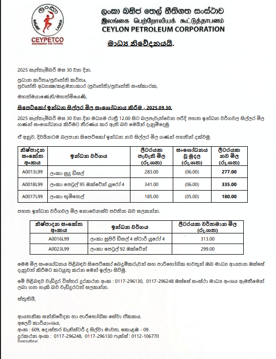இலங்கை பெற்றோலியக் கூட்டுத்தாபனத்தின் மாதாந்த எரிபொருள் விலை திருத்தத்தின் படி இன்று (30) நள்ளிரவு முதல் அமுலுக்கு வரும் வகையில் எரிபொருள்களின் விலைகள் குறைக்கப்பட்டுள்ளன.