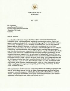 இலங்கைக்கான வரியை 30% ஆக நிர்ணயித்துள்ளதாக அமெரிக்க ஜனாதிபதி டொனால்ட் டிரம்ப் சமூக ஊடகங்களில் அறிவித்துள்ளார்.
