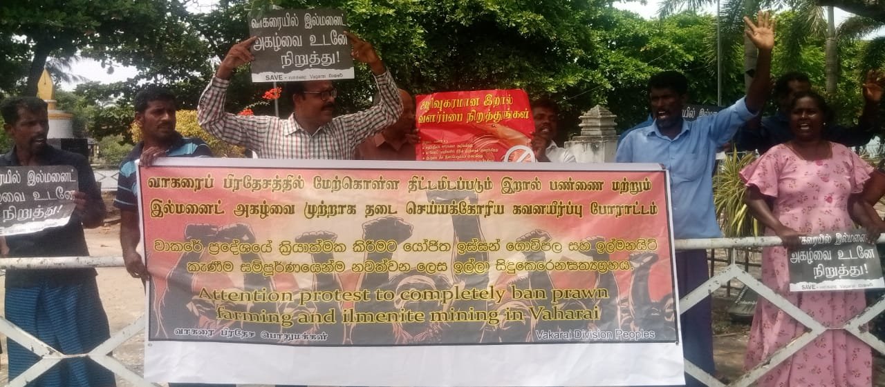 வாகரை பிரதேசத்தில் மேற்கொள்ள திட்டமிடப்பட்டுள்ள இறால் பண்ணை மற்றும் இல்மனைட் அகழ்வை முற்றாக தடை செய்யக்கோரியே குறித்த ஆர்ப்பாட்டம் இடம்பெற்றுள்ளது.