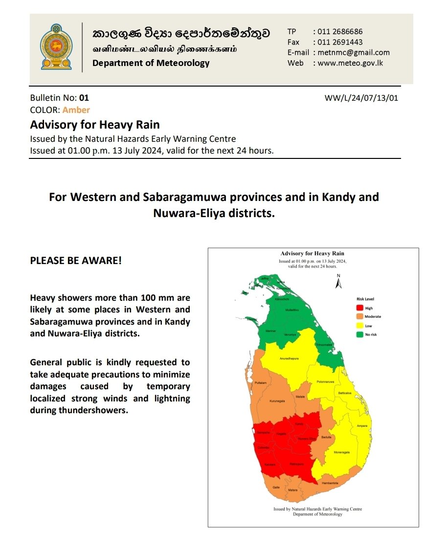 மேற்கு மற்றும் சப்ரகமுவ மாகாணங்களிலும் கண்டி மற்றும் நுவரெலியா மாவட்டங்களிலும் சில இடங்களில் 100 மில்லிமீற்றருக்கும் அதிகமான பலத்த மழை பெய்யக்கூடும் எச்சரிக்கை விடுக்கப்பட்டுள்ளது.