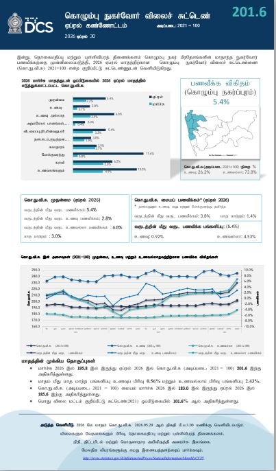 கொழும்பு நுகர்வோர் விலைச் சுட்டெண் அடிப்படையிலான முதன்மை பணவீக்கம் ஏப்ரல் மாதத்தில் 5.4 சதவீதமாக அதிகரித்துள்ளது.