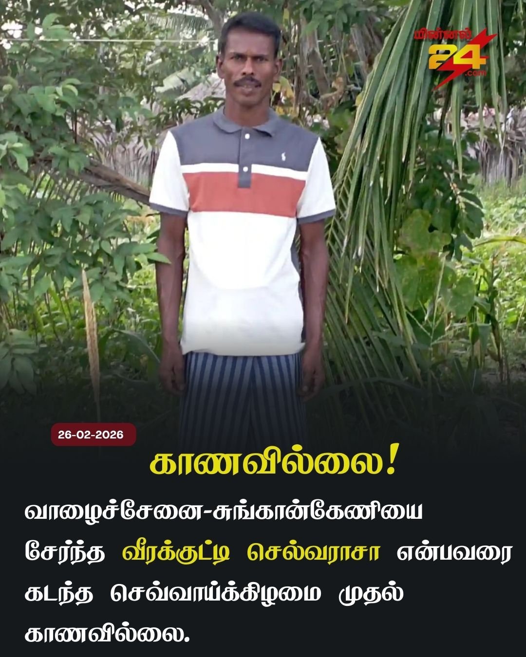 மட்டக்களப்பு-வாழைச்சேனை-சுங்கான்கேணியை சேர்ந்த, வீரக்குட்டி செல்வராசா (வயது 51) என்பவரை, கடந்த செவ்வாய்க்கிழமை முதல் காணவில்லை, என வாழைச்சேனை பொலிஸ் நிலையத்தில் முறைப்பாடு செய்யப்பட்டுள்ளது.