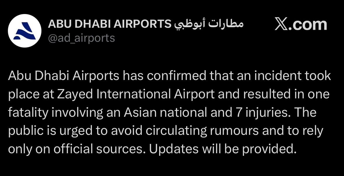 சயீத் சர்வதேச விமான நிலையத்தில், ஒரு ஆசிய நாட்டவர் உயிரிழந்ததாகவும், ஏழு பேர் காயமடைந்ததாகவும், அபுதாபி விமான நிலைய தகவல்கள் உறுதிப்படுத்தியுள்ளன, என்று விமான நிலையத்தின் X பக்கத்தில் அறிக்கை ஒன்று பதிவிடப்பட்டுள்ளது.