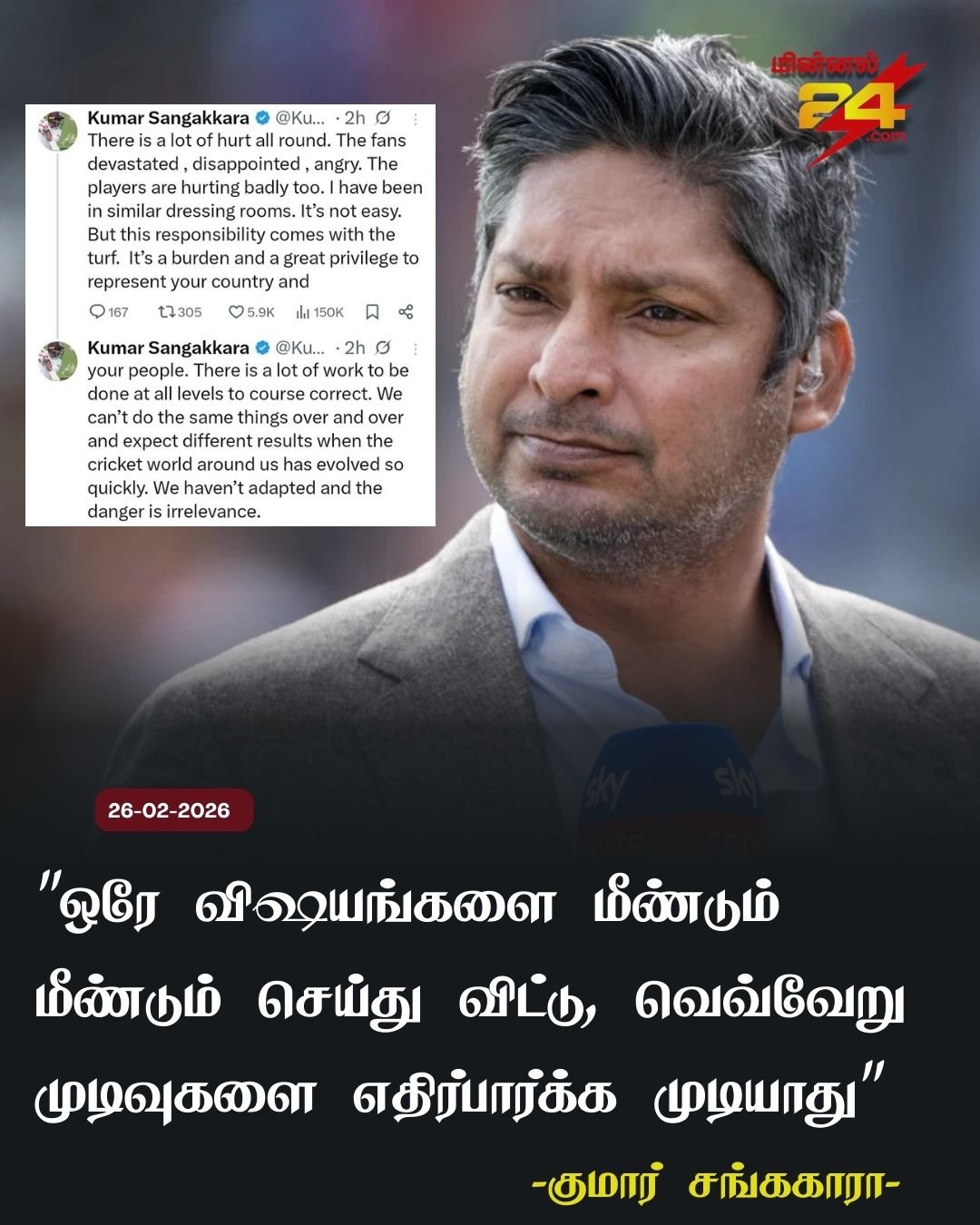 “வேகமாக வளர்ந்து வரும் கிரிக்கெட் உலகிற்கு ஏற்ப இலங்கை மாற வேண்டும்” என்று சங்ககாரா எச்சரித்தார், “அதே அணுகுமுறைகளை மீண்டும் மீண்டும் செய்வது, வெவ்வேறு முடிவுகளைத் தராது” என்று வலியுறுத்தினார்.