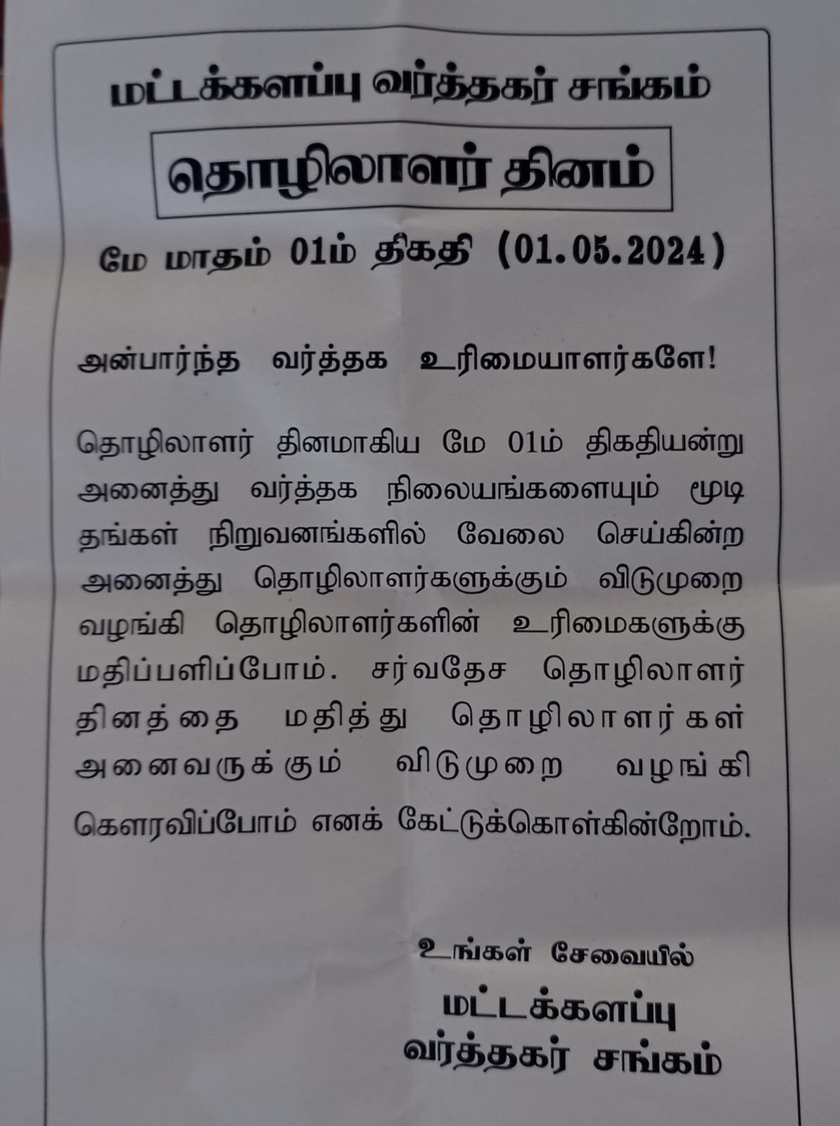 குறித்த அறிவித்தலில் நாளை செவ்வாய்க்கிழமை மே தினத்தன்று அனைத்து வர்த்தகர்களும் தமது வர்த்த நிறுவனங்களை மூடி அவரவர் வர்த்தக நிலையங்களில் பணியாற்றும் பணியாளர்களுக்கு விடுமுறை வழங்குமாறு கோரிக்கை விடுக்கப்பட்டுள்ளது.