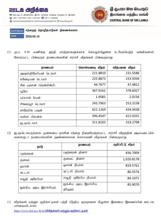 இலங்கை மத்திய வங்கி இன்று வெளியிட்டுள்ள நாணயமாற்று வீதத்தின்படி,
